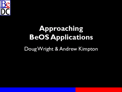 So Approaching BeOS Applications, what am I going to tell you about? I'm going to go a little bit more in depth into the basic pieces that you need to build application in the BeOS. Hello. There we are.