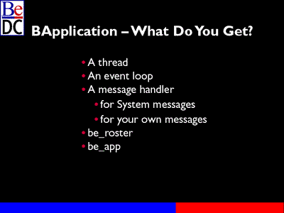 So what do you get when you create this BApplication object? Well, like I said before, you get a thread and what's going on in that thread is an event loop and there's a message cue where your messages can be posted and the event loop pulls messages out of that cue, processes those messages, hands them off to message handlers.