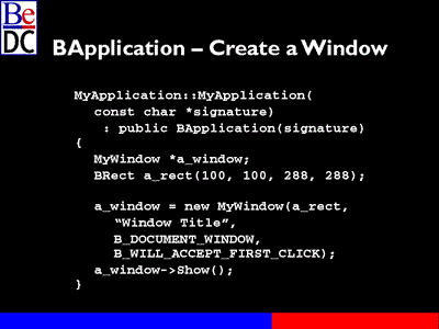 So let's create a window in our application. Very first thing pretty much anybody's going to do in their application is put up a window. And if you look up there at the top, we get our signature and we're inherited from BApplication.