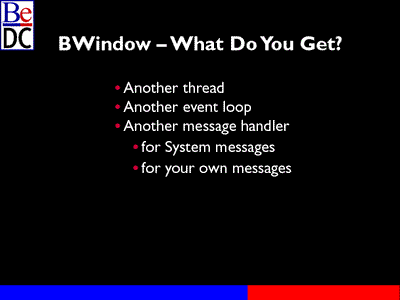 So what do you get when you create a BWindow object? Well, guess what? You get another thread so automatically, you know, create an application, create a window, you've got two threads running and this thread has its own event loop, has its own message cue, pulls messages out of its own message cues and sends them off to handlers.