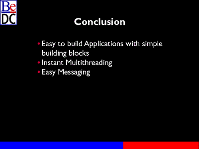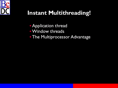 Okay. The BeOS provides you with a framework, simple building blocks that you use to put together applications, objects like application object, window object, menu object, messages. They all fit together to allow you to build applications that let you -- they give you instant multithreading.