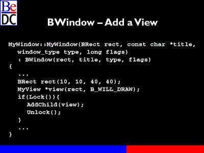 Now, you'll notice we're calling AddChild -- if you go back up to the top where there's a subclass of BWindow. So we created a BWindow object, but we know that BWindow doesn't start running until you show it for the first time, and so no show has been called so the thread's not running so we don't need to lock it, just so you know, because we talked about the lock thing a bunch before.