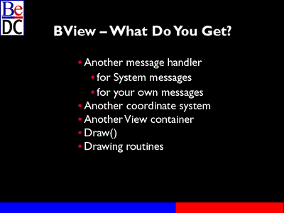 So you're starting to see probably the progression of simplicity that is in the BeOS. The application object thread, it's an event loop, it's a handler, window, thread, event loop, handler, view. It's not a thread and event loop, but it is a handler and they all -- all the function calls are very similar in each one of them. They're all built on each other.