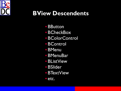 So there's a whole bunch of BView descendants. This is not even close to the whole list, buttons, CheckBoxes, all the typical GUI controls. The one thing to notice there is that there is this object called BControl. This is a generic the control object and the things like button and CheckBoxes are derived from that. Well, BControl is derived from view, so all those things are derived from BControl.
