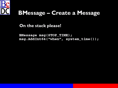 So here we create a BMessage. The parameter is the "what" field, so this is some constant that we've defined called STOP_TIME and we call message AddInt64 to add a 64-bit integer. We're calling the field "when" and we call system_time to stick the current 64-bit system_time in microseconds into that "when" field, so then later we call FindInt to get that data right back out of that message.