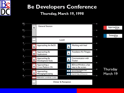 We also have, in the adjacent room over here, a developer lab. It not only has open BeOS workstations that you're free to use, but we're also featuring a number of developers who are showing shipping products, as well as future products, and those include StarCode, BeatWare, Adamation, Gobe. Metrowerks is there. We even have O'Reilly & Associates, who are selling the Be Developers Guide, as well as a number of other books. So you might want to check that out during the day.