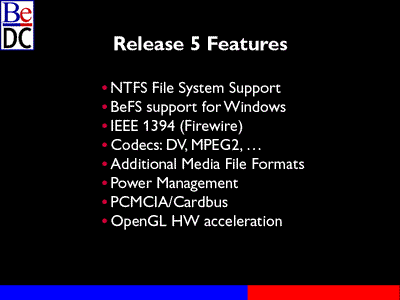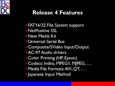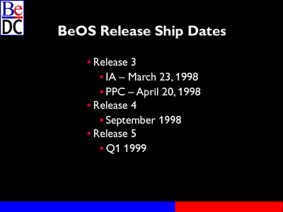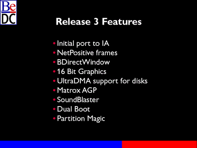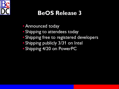 So let's start with BeOS Release 3. We're announcing it today. It's going to ship to attendees today. If you haven't picked up your BeOS Release 3 CD -- it's in a little trifold -- please make sure you do so. We want to make sure everyone has the full, official release today.