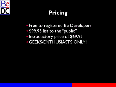 The pricing. First of all, BeOS Release 3 is free to registered developers. That has always been the goal and continues to be the goal. Why would we want you to be our customers, when you're our partners? Then that's where it will be. And so the release continues to be free to developers.