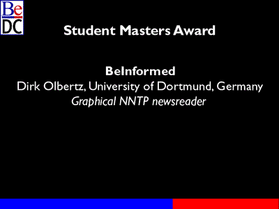 And our winner in the student category is from Dirk Olbertz, University of Dortmund, Germany, is BeInformed. This is a graphical NNTP news reader. I think as the judges went through the student category, they liked this one because it has a very good user interface and can be used as a template for other people doing Internet utilities. I will show you that one.