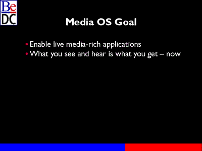 Our goal is to be the media OS. We hope to provide you with an operating system and a set of kits that let you do the kinds of media-rich applications that we were demonstrating yesterday. Alex likes to call it "what you see and hear is what you get *now*", not later on after you've rendered and played back the finished product.