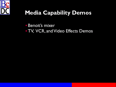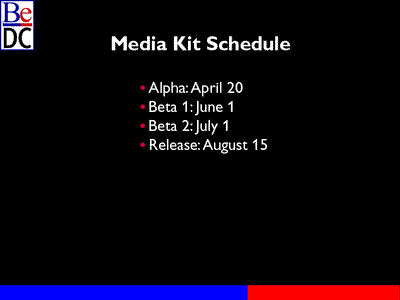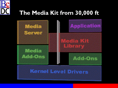 Then we'll take a look at the Media Kit architecture from 30,000 ft., and after that describe what Be is going to do to fill in some of the holes in that Media Kit architectural plan. We'll finish up by giving you a schedule for the alpha and beta releases of the media kit.