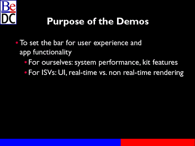 What we're going to do first is take another look at some of the demos that you saw in the opening session, and go into a little bit more detail on the functionality in those programs. We'll talk a bit about the hardware we're using, and the overall techniques used in the demos.