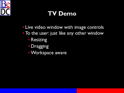 Mr. Sakoman: This next application was written for Dominic, who wanted to watch a South Park tape in his office So I sat down and did a quick version of this program for him. The idea was to provide a live, resizable video window with image controls, and in typical Be fashion we wanted these video windows to be just like any other windows so that the user doesn't feel that there is anything special about them. They resize; they drag; they're work-space aware. They feel completely natural. So let's move to another work space.