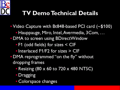 We're DMA'ing directly to the screen into a BDirectWindow. The DMA program is actually handling clipping so that you can move other windows on top of the video window with clipping handled properly. There are no strange artifacts on the screen as you move your window around.