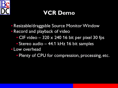 What we'll do next is take a look at the VCR demo. The goal here was to capture some South Park clips for special use. This program is basically a CIF video recorder. It captures uncompressed 16 bit per pixel video at 30 frames per second, as well as the stereo audio tracks at 44.1 kHz.