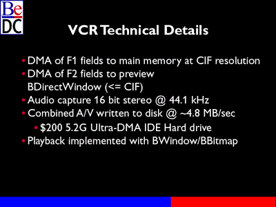 We're capturing audio at 16 bits, 44.1 kilohertz, combining that into the video buffer, and writing the buffer to disk through the file system. The combined data rate is about 4.8 megabytes per second. There is no special buffering going on here. We just capture each frame and issue a write command to the Be file system. We're using a $200, 5.2 gigabyte drive that we bought from Fry's.
