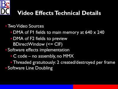 We're capturing the even fields and using those for the preview BDirectWindows. There's one thing that we didn't mention in the general session. I often get questions inquiring about how lightweight Be threads are. I attempted to answer that question somewhat dramatically with this app. To do so, I was extremely gratuitous with my use of threads. In fact, for every frame I spawn two threads, one for the even scan lines, another for the odd scan lines. I then allow the threads to compute the effect and then die.