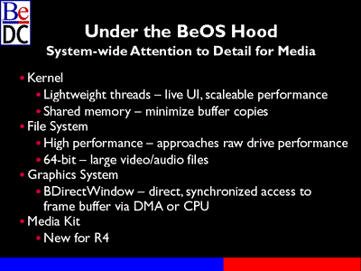 Let's move on and talk a little bit about what's happening in the media space for BeOS. First I'll talk about the OS in general. You don't get this type of media performance by just implementing a set of media APIs.