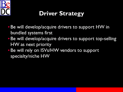 Mr. Sakoman: There have been many questions about drivers for media devices, and file formats support. So I thought I would take this opportunity to give you an idea of what our plans are. We have limited resources at Be so we don't have a prayer of supporting every piece of hardware that's ever been made, nor of even keeping up with all new devices as they come out. So we're going to have to be very careful in how we target our resources.