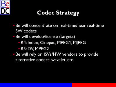 We really want to focus on doing absolutely the highest performing codecs that we can either develop or license. We're shooting for real time or near real time software codecs. Our targets for R4 include Indeo, Cinepac, MPEG1, and MJPEG. For R5, we're hoping to add DV and MPEG2 codecs.