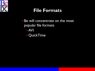 File formats support is another type of Media Kit plugin. We're going to concentrate on the popular ones, AVI, QuickTime. We're going to rely on third parties to do a lot of the others