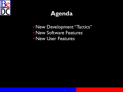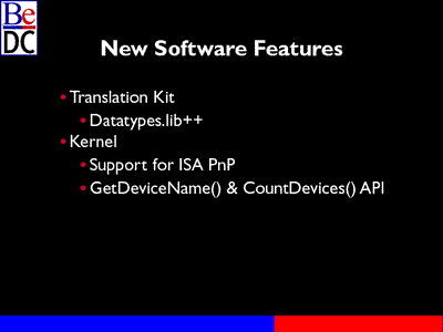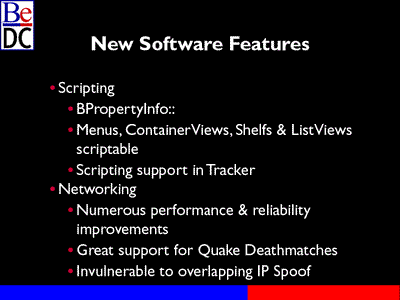 Having had all these questions now about DirectWindow, that probably leads us to my next bullet point, probably one of the most significant, and I think perhaps strewn upon you as developers, everybody all knew about Intel, they all knew the Intel architecture was going to be available for this release. I don't think anybody really expected BDirectWindow, I don't think everybody expected some of the features they saw in yesterday morning's demonstration and Pierre Raynaud-Richard's demonstration yesterday afternoon. Perhaps it's one of the delights of being at Be, we can spring those things on you every so often and one of the more significant features about 3 is not the support for Intel, but the support for DirectWindow.