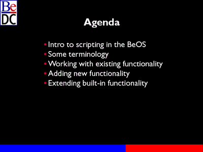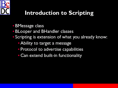 What we're going to be talking about today is scripting in the BeOS. I'm going to start with an introduction to some of the concepts in the scripting architecture and this is in the extended track session, so it's going to bend -- I'm going to dive into some more in-depth look into what you do if you want your application to be scriptable.