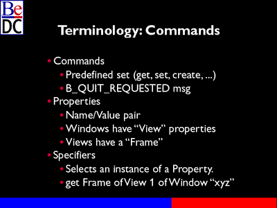 Some of the terminology I'm going to go into now. First we have something we call commands. It's basically just the action of the message. There's a predesigned set that Be defines, and you'll find it in one of our header files, for things like set or get, create, delete, execute, standard actions that you might want to initiate on some object.