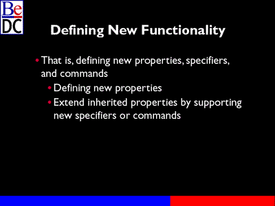 Okay. Next I'm going to go into how you define new functionality and there's two kinds of functionality I'm talking about here. One is kind of extending what's already built into the system, and that might be by defining some new ways to specify a property or, you know, or extending the functionality of a built-in property.
