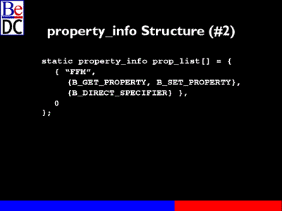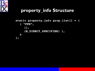The first thing they would have done is used something that's new in R3, which is BPropertyInfo class and an associated property_info Structure. And this is a structure where you describe the properties that this particular object understands and you describe the specifiers that can be used to identify a particular property.