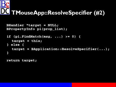 Peter Potrebic: The question was how in the previous ResolveSpecifier -- now, this was an extended session, so it kind of assumes some knowledge of the BeOS, although that's not necessarily the case, so these questions are fine, but it might be kind of difficult to explain some of those concepts without having a lot more slides, but I'll try.