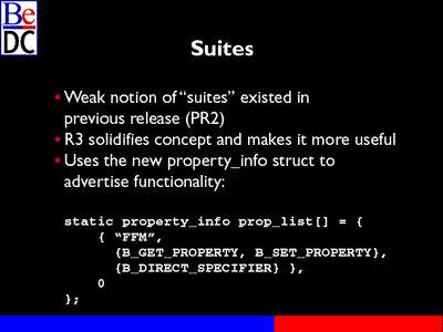 I'm going to talk a little bit about suites and the concept of suites. There was a simple concept in the last release, PR2 and that's gotten a lot richer, a lot more robust in R3 and it focuses on this property_info Structure that you've seen a couple times where -- and you've seen it in action for dealing with messages, and it allows -- but it also allows an application to advertise its functionality.
