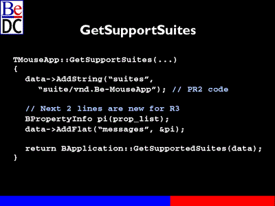 And basically, I've just repeated here that last property_info Structure that we've seen and so once you've defined such a structure describing the types of commands an object understands, you also want to work with another member function called GetSupport -- oops, should Be GetSupportedSuites and you would override that function and here's our mouse application again overriding GetSupportedSuites and in PR2 you might well have had this code, this first two lines, where you define a name for the suite of messages that you understand, and that suite could then have a published written description that people could access on the Internet or wherever, describing what that means.