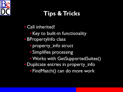Just a couple tips and tricks. I probably said this first one five times today. Call inherited, not the key word, but the parent class. The BPropertyInfo object is a new object and take advantage of that, you know, it does a nice job of allowing you to express the functionality in your system and its key for working with GetSupportedSuites.