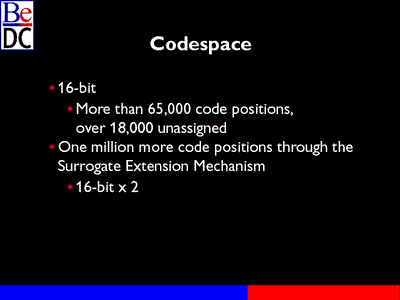 There's some private area. That will remain unassigned so people can have whatever characters they want in there, but I doubt any time soon. If we do fill up the unicode code space, though, there is a way to extend it using the surrogate extension mechanism. That basically says two unicode characters will -- or two unicode values will mean a different character, so it basically is a 32-bit encoding. But the BeOS does deal with that, untested because it hasn't been used yet anywhere. But we do deal with that in theory.