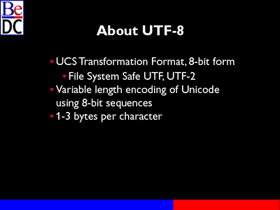 UTF-8 is a form of unicode, a variable length of unicode, a little more tricky to use compared to straight unicode. What it is, is a string of 8 bits, single-byte string that encodes straight 16-bit unicode. Typically, the characters are 1, 2, 3 bytes in length so it is multibyte which is why it's a little trickier. There's a big reason we chose it: It's backwards compatible with ASCII. That was a big win.