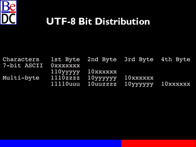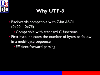 So it's very easy to forward parse UTF-8. You look at the first byte. To jump to the next character, you would jump by the number of ones there, in essence. So it's a little trickier than simply indexing an array of bytes or shorts in the case of unicode. But given that simple rule, it's pretty easy to deal with.