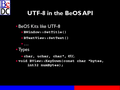 The same with BTextView. It deals exclusively. There are some conversion functions that I'll explain a little later that help you in converting to and from UTF-8 with the other encode. The type times are standard. No new special times. A lot of times they're wide characters. We don't have to deal with that. Consequently, when we added unicode support, UTF-8 support into the kits, the only function that had to change to accommodate that was this BView::KeyDown function. That was before a single byte. Now, it's a string which is what the user has typed on the key. It has the number of bytes that's being passed to you. That was pretty much the only change that had to occur for us to support UTF-8 from an API standpoint.