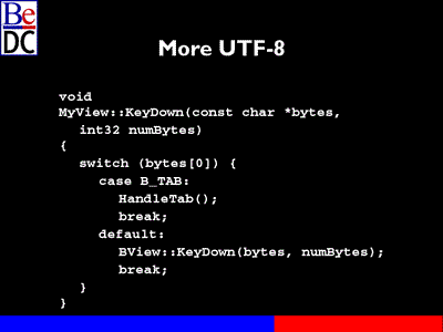 If it's a multibyte UTF-8 character, it won't be an ASCII value. If you case on a Be tab, which is basically the tab character, it won't jump to here. So you can always assume that something is ASCII and it will always work that way. So it's very simple. A lot of our kit classes such as BButton or BCheck process -- this is cut and pasted from BButton, I think. So a typical way of dealing with common characters.