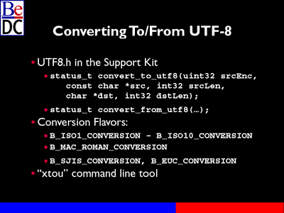 The conversion functions I mentioned earlier in the UTF-8 header file, in the support kit, it's in libbe. There's convert to UTF-8. They're just C functions, not C++,a little tricky to deal with. There are a lot of parameters you have to pass through. But it does the job. Basically you specify what sort of encoding you want. You want to convert to or from. The flavors are here. B ISO1, 1 through 10 basically. We also have a Macintosh Roman character set, and a table for shift, SJIS, and these will use these tables to convert the buffer that you pass in, given the length into the buffer that you splice and the length of that buffer, convert from the same way, the reverse operation.