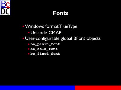 BeOS API is primarily UTF-8-based. For example, to set the title of a window, there's a function called BWindow::SetTitle. That expects a UTF-8 string. You can pass it, you know, usually the Roman characters which is ASCII. Since that's UTF-8, you really don't have to think about it in terms of UTF-8. If you wanted to have a weird character in it or a Japanese title, for example, you just pass it in and the app server knows how to deal with it.