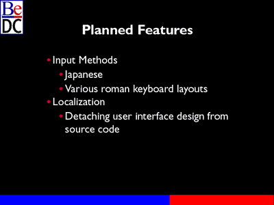 The actual Japanese input method, the core conversion engine has actually been started, but the input method, what will happen is I'm coming up with the generic API, which is not specifically tailored for Japanese, but for input methods in general so that third parties will be easily -- they'll be able to write add-ons which do Korean input or potentially even I might try to make it generic enough so you can do pen tablets input, any sort of input that is not the standard keyboard direct Roman input, we'll go through this Japanese -- excuse me -- this input method architecture.