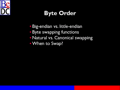 In general, we're going to talk about Big-endian versus Little-endian platforms. We're going to talk about byte swapping in general. Different methods for tackling swapping of the bytes, natural versus canonical, and then when you actually need to swap.
