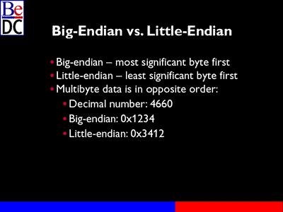 So basically a basic runover of Big-endian versus Little-endian. How do they keep track of memory? Big-endian keeps track of multibyte data with most significant byte first and Little-endian with least significant byte first. Example, this one, the bytes are swapped. Fairly straightforward. Most of you guys hopefully understand that already.
