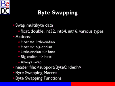 We also provide byte swapping functions for arrays of data or types. So, for example, if you've BRect, BRect has a bunch of different data in there. You can pass it to one of our functions called swap_data() that will go ahead and do the swapping for you. If you have an array of int64's, you can pass it and it will swap each one individually. That function is -- that is called swap_data where you pass the type_code, the type of data you're working with, you pass a pointer to that data. You basically pass it a size for how images that data is, if it was an int64, you would pass sizeof(int64). Also what type of action you want to swap. Again, the same thing we talked about earlier.
