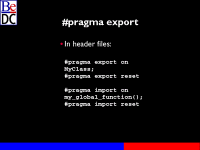 #pragma export is pretty simple. Declare in the header files: #pragma export on, then the symbol you want to export, and then #pragma export reset. The same thing with import. You don't really have to worry about import because on PowerPC it's assumed that symbols are going to be imported. If the symbol is there and you link it with something, it will automatically get imported for you. You don't have to specifically declare that. With Intel you have to specifically import a symbol. The default is it's an internal symbol not used either exported or imported, so the same thing with class function, global data, for #pragma import on.