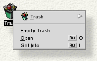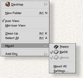 Each of the icons on the desktop has its own context menu. Context menus for folders and files are identical to the Tracker's File menu, as described in Playing with Files and Folders. The context menu for a disk provides some basic operations on the disk (Open, Get Info, Edit Name), and lets you unmount the disk, as described next.