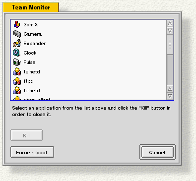 If an application is causing problems, but the trouble falls short of a system crash, you can use the Team Monitor to kill the application without having to reboot. Press Control+Alt+Delete (theDel key on the numeric keypad or the Delete key above the arrow keys) to bring up a selection window that shows all currently running apps (and servers).