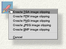 Some applications give you a choice of formats to save the clipping in; to display the menu of format choices (or any other options), drag the selection with the right mouse button. For example, open an image in ShowImage; select a portion of the image, and drag it to the desktop with the right mouse button. When you release the clipping, a context menu of formats pops open, as shown here.