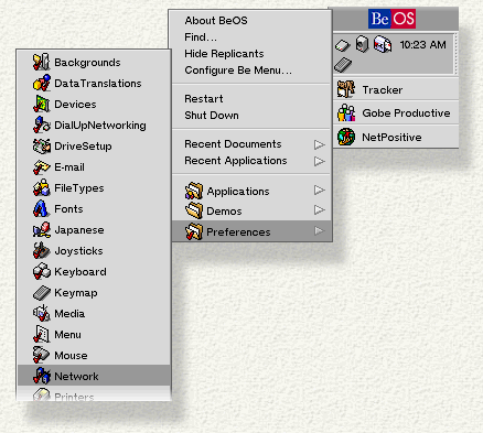 If you're connecting to the Internet (or to a local network) through an ethernet card, you need to use the Network preferences application to configure your connection. To launch Network, click on the Be logo, open the Preferences item, and click on Network :